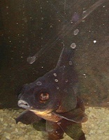 One characteristic of goldfish as a species is their non-linear thinking. If you ever watch a goldfish try to attain an objective, for instance swimming across the tank to get some food, it may sometimes appear as if the goldfish will forget the goal, then remember, then forget, then remember again, all the way to the other side. They are much more interested in the journey than the goal. In this, Goldfish are the opposite of cichlids, who singlemindedly focus on their agendas better than most people. However this non-linear mental state should not be mistaken for stupidity. Several of our goldfish have been remarkably intelligent. However our orange fantail, Piggum, is not one of them!