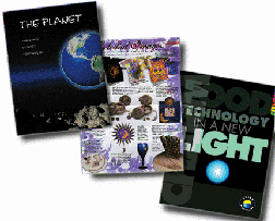 Shown: folder for The Planet, a T-shirt and rockwear distributor, direct mail piece for BMG Music Service, folder design for Charm Sciences, a food technology company.