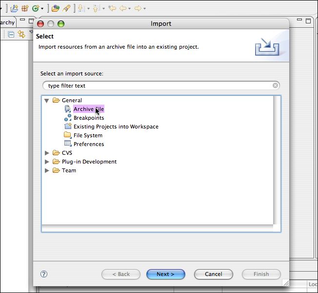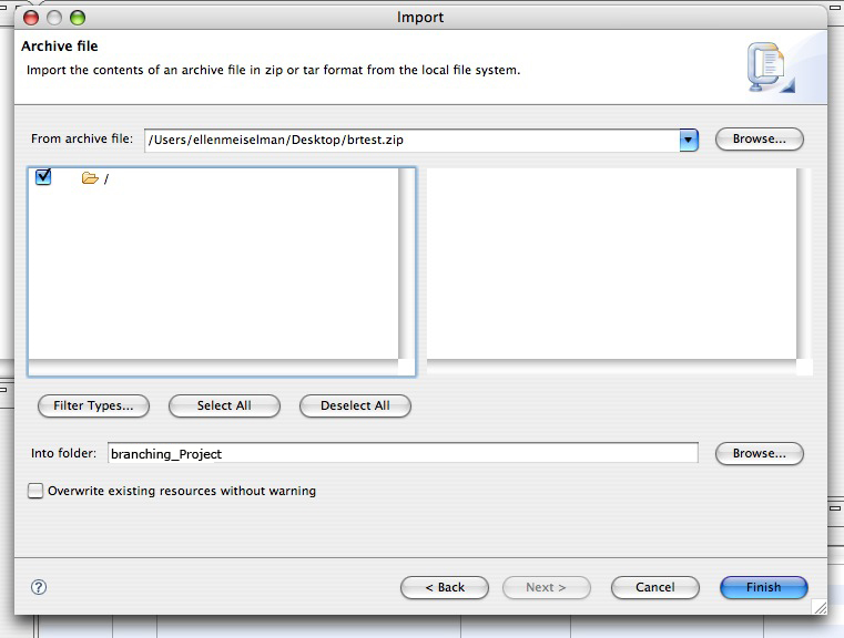 - Click Browse... then navigate to brtest.zip. The "Into folder" setting should already be set to your project folder. Click Finish.