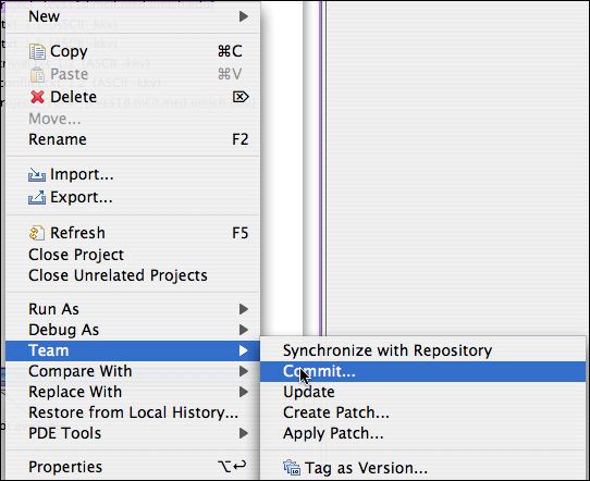 - Commit all the changes by right-clicking the folder and selecting Team>Commit. Type a comment like "First iteration changes made by Paul." The version numbers will be 4 digit numbers: the 2 represents the branch number.