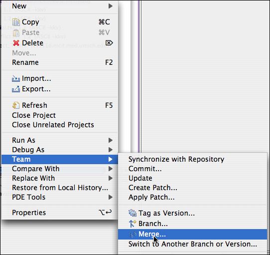- Right click on the project folder and select "Team>Merge...".