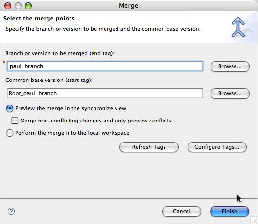 - It should fill in the common base version for you, starting with "Root_". Do not check "Merge non-conflicting changes and only preview conflicts." Click Finish.