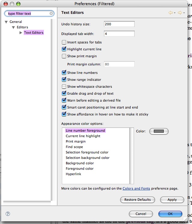 - Show line numbers if necessary by right clicking in text editor, select Preferences..., and check Click show line numbers.